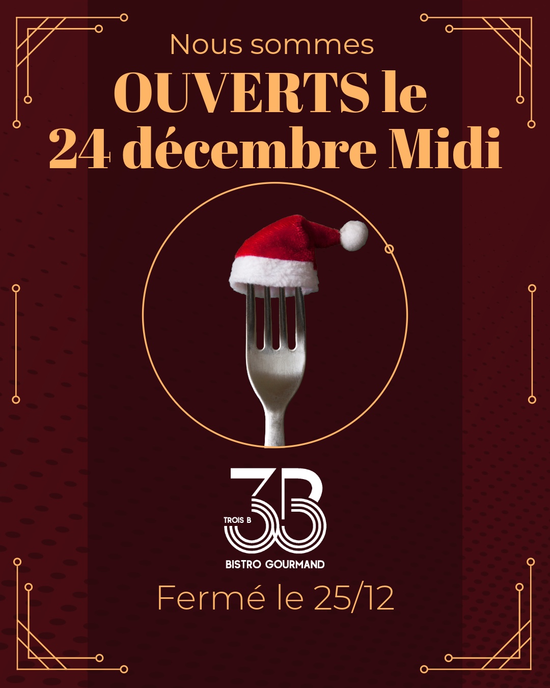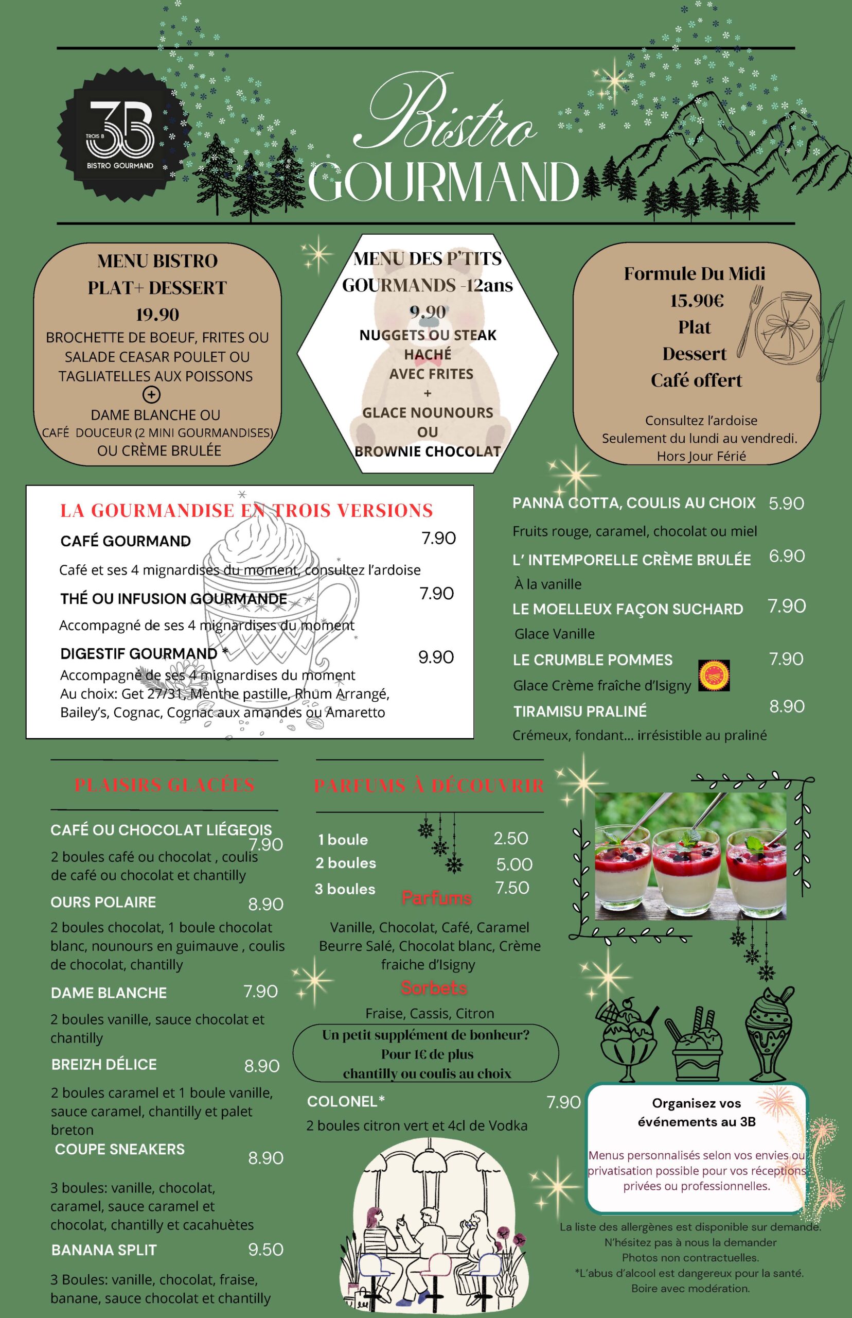 Envie d’un moment convivial autour d’un repas de fin d’année festif et convivial en équipe ?Le 3B Bistro Gourmand vous permet d’ installer 50 convives !